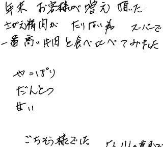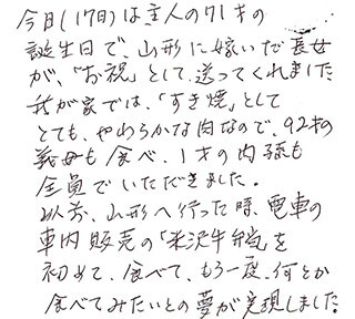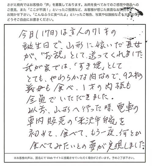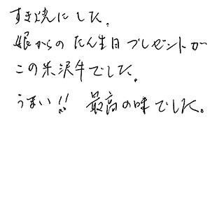 初めて米沢牛を食べました。とろけるような甘さと柔らかい食感で楽しい食卓を囲めました。それも娘の嫁ぎ先のお母様より贈り物でした。里帰りで食事のお世話が大変ということでの心配りでした。あまりに豪華で感激致しました。これからも年に1度やる度、食べてみたいと夫と話しました。これから孫が大きくなって節目には御社のお肉を食べさせて思い出になるよう増々仕事を頑張ろうと思います。できれば東京にいる娘家族がディズニーで楽しめたらと願います。本当にごちそう様でした。