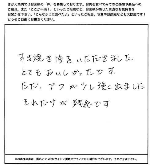 好き焼肉をいただきました。とてもおいしかったです。ただ、アクが少し強くでました。それだけが残念です。