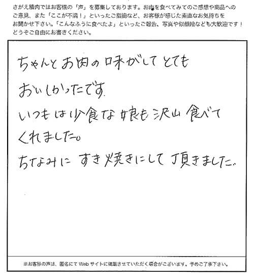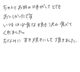 お歳暮で御社のお肉を頂きすきやきにして、家族で堪能致しました。香りよく、やわらかで本当にとても美味しかったです。大切に育てて下さった命を感謝しながら有難く頂きました。やはり和牛は格が違います。TPPで安い牛肉が入ってきても日本のお肉を選びます。また御社の牛肉リピートします。放射性物質検査もしていてとても安心です。