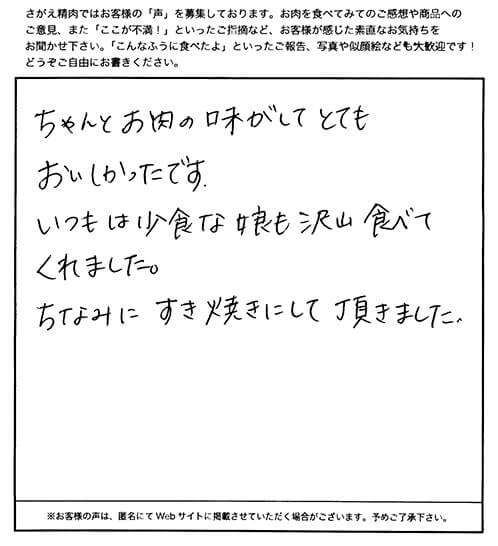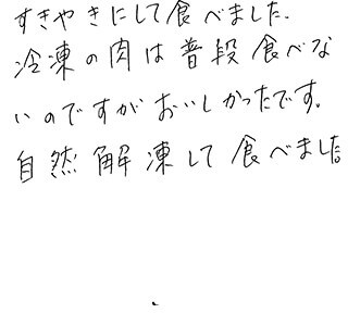 ちゃんとお肉の味がしてとてもおいしかったです。 いつもは小食な娘も沢山食べてくれました。 ちなみにすき焼きにして頂きました。