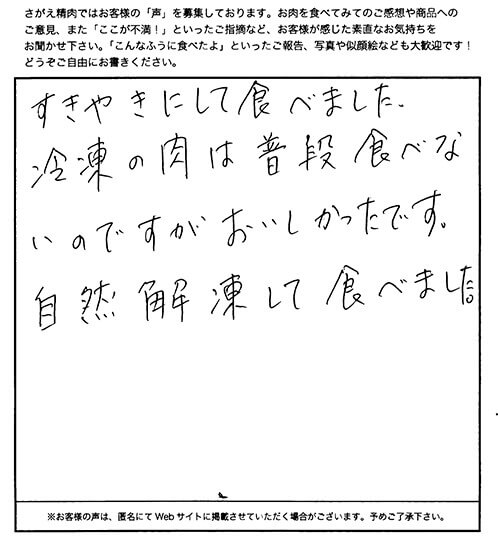 すきやきにして食べました。冷凍の肉は普段食べないのですがおいしかったです。自然解凍してたべました。