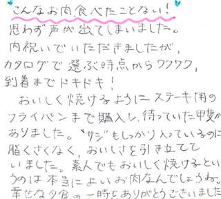 お客さまの声や口コミ・レビューをご紹介いたします。お寄せいただいた温かいお言葉を励みに、もっと、もっと、ご満足いただけるお肉をご提供できるよう努めてまいります。