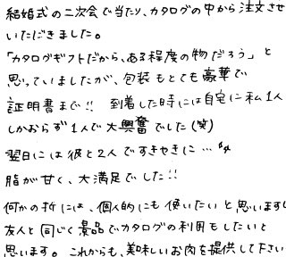 結婚式の二次会で当たり、カタログの中から注文させていただきました。「カタログギフトだから、ある程度の物だろう」と思っていましたが、包装もとても豪華で証明書まで!!到着した時には、自宅に私1人しかおらず、1人で大興奮でした(笑)翌日には彼と2人ですき焼きに…☆脂が甘く、大満足でした!!何かの折には、個人的にも使いたいと思いますし、友人と同じく景品でカタログの利用もしたいと思います。これからも、美味しいお肉を提供して下さい