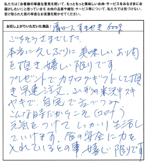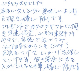 ごちそうさまでした。本当に久しぶりに美味しいお肉を頂き、嬉しい限りです。プレゼントでカタログギフトして頂き早速注文。山形の米沢牛スキヤキで自宅で舌つづみ。こんな時だからこそ(コロナ)元気をつけてしっかり生活していけます。色の安全に力を入れているとの事、嬉しい限りです。