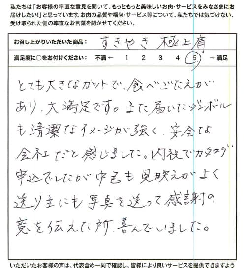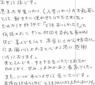 お世話様です。息子の卒業いわい(入学いわい)のお礼返しとして、親せきに使わせていただきました。だれからも好評で、「とてもおいしかった!」と伝説のようにずっと何回もお礼を言われるほど、喜んでもらえて、本当にさがえ精肉さんにお願いしてよかったと心から思い、感謝いたしております。夫と2人でも、すきやきをいただきましたが、やわらかく、甘み、うまみがあり、最高でした。また、いつかおとりよせして食べたいです。お得な切りおとしなど、とても嬉しいのでふやしてほしいです。