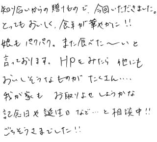 知り合いからの贈りもので、今回いただきました。 とってもおいしく、食卓が華やかに!! 娘もパクパク。また食べた〜いと言っております。HPをみたら他にもおいしそうなものがたくさん.... 我が家もお取り寄せしようかな 記念日や誕生日など....と相談中!! ごちそうさまでした!!