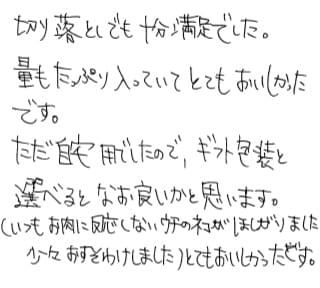 切り落としでも十分満足でした。 量もたっぷり入っていてとてもおいしかったです。 ただ自宅用でしたので、ギフト包装と選べるとなお良いかと思います。 (いつもお肉に反応しないうちのネコがほしがりました。少々おすそわけしました) とてもおいしかったです。