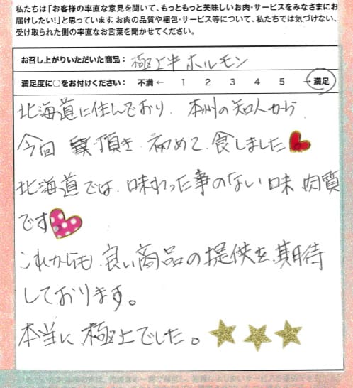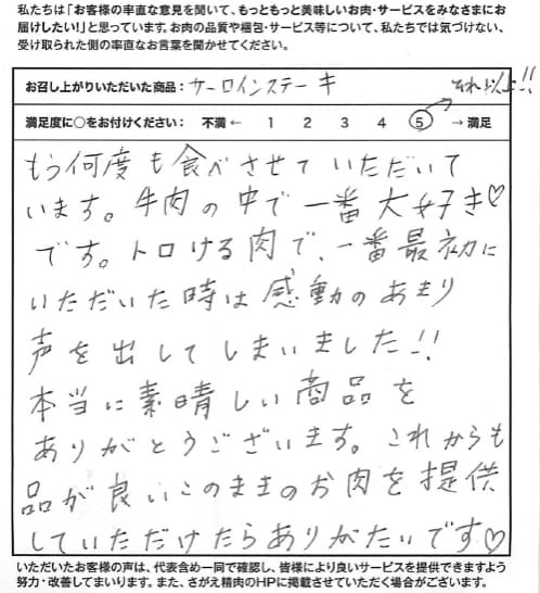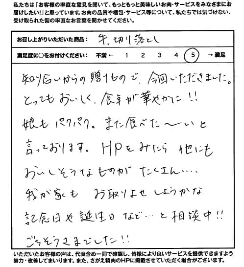 お客さまの声や口コミ・レビューをご紹介いたします。お寄せいただいた温かいお言葉を励みに、もっと、もっと、ご満足いただけるお肉をご提供できるよう努めてまいります。