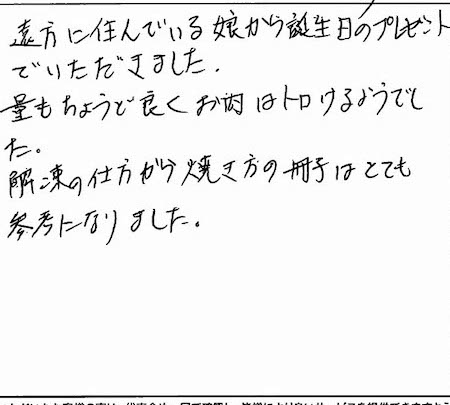 遠方に住んでいる娘から誕生日のプレゼントでいただきました。量もちょうど良くお肉はトロけるようでした。解凍の仕方から焼き方の冊子はとても参考になりました。