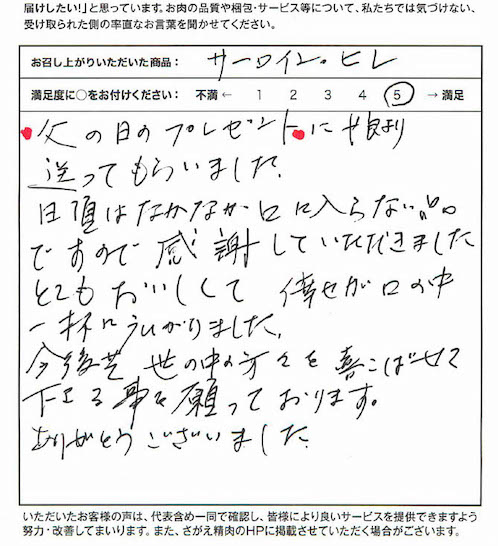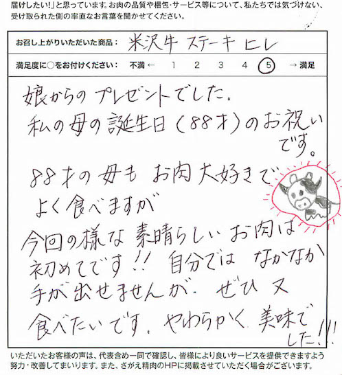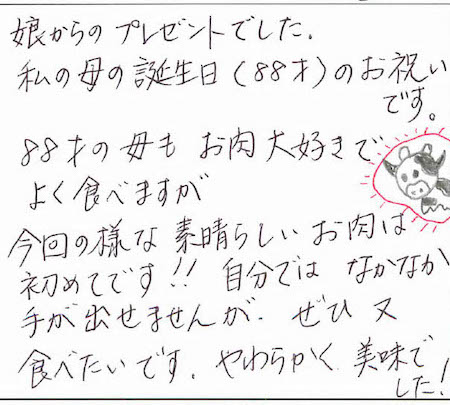 娘からのプレゼントでした。私の母の誕生日(88才)のお祝いです。88才の母もお肉大好きでよく食べますが今回の様な素晴らしいお肉は初めてです!!自分ではなかなか手が出せませんが、ぜひ又食べたいです。やわらかくて美味でした!!!