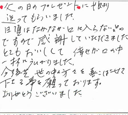 父の日のプレゼントに娘より送ってもらいました。日頃はなかなか口に入らない品ですので感謝していただきました。とてもおいしくて幸せが口の中一杯に広がりました。今後も世の中の方々を喜ばせて下さる事を願っております。ありがとうございました。