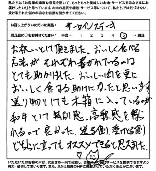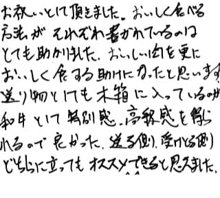 お祝いとして頂きました。おいしく食べる方法がそれぞれ書かれているのはとても助かりました。おいしい肉を更に美味しく食する助けになったと思います。送り物としても木箱に入っているのが和牛として特別感、高級感を得られるので良かった。送る側、受けとる側どちらに立ってもオススメできると思えました。