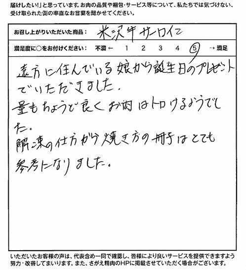 8月末孫達と岩手・山形方面へ出かけました。その際、米沢牛を食し孫達もおいしいと喜んでおりました。そこで孫が米沢牛を選び老人の日のプレゼントに送っていただいたようです。感謝でいっぱいでした。おいしくいただき、孫と又行こうと約束したところです。ありがとうございました。