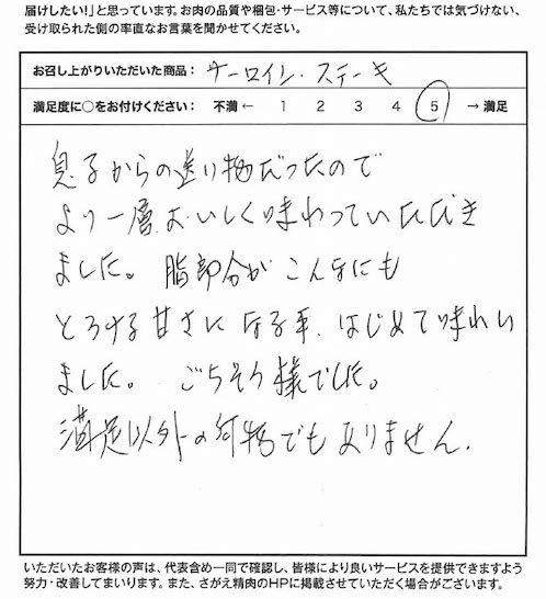敬老の日に合わせ、82才になる母のために取りよせました。送られてきた肉を見た母は「全部食べれるかなぁ」と一言。私が肉を焼いてあげ、結局サーロイン1枚を母はペロッと食べて一言「あぁ〜おいしかったよ」と大変満足していました。お肉の品質もよく、やわらかく、肉の油も「あまみ」があり大変おいしく頂きました。次回は、別のお肉を頼んでみたいと思います。生産者の皆様、これからもガンバッテ下さい。