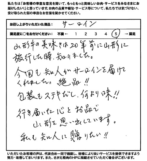 山形牛の美味しさは20年前に山形に旅行した時、知りました。 今回も知人がサーロインを届けてくれました。絶品!! 包装もステキだし、何より味!! 行き届いた心とお品で山形を思い出しています。 私も知人に贈りたい!!