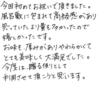 今回初めてお祝いで頂きました。 風呂敷に包まれて高級感があり思っていたより量も多かったので嬉しかったです。 お味も、厚みがありやわらかくてとても美味しく大満足でした。 今度は、贈る側として利用させて頂こうと思います。