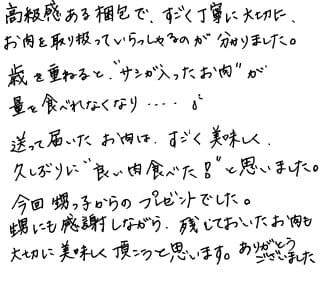 高級感のある梱包で、すごくていねいに大切にお肉を取り扱っていらっしゃるのが分かりました。 歳を重ねると、"サシが入ったお肉"が量を食べれなくなり.... 送って届いたお肉はすごく美味しく、久しぶりに"良い肉食べた!”と思いました。 今回甥っ子からのプレゼントでした。 甥にも感謝しながら、残しておいたお肉も大切に美味しく頂こうと思います。ありがとうございました。
