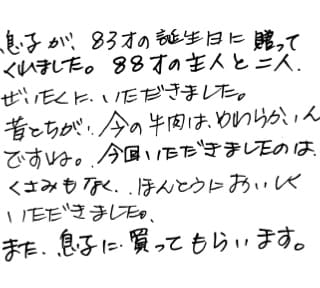 息子が、83才の誕生日に贈ってくれました。88才の主人と二人、ぜいたくに、いただきました。 昔とちがい、今の牛肉はやわらかいんですね。今回いただきましたのは、くさみもなく、ほんとうにおいしくいただきました。 また、息子に買ってもらいます。