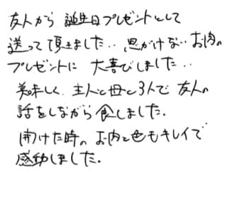 友人から誕生日プレゼントとして送って頂きました。思いがけないお肉のプレゼントに大喜びしました。。 美味しく主人と母と3人で友人の話をしながら食しました。 開けた時のお肉も色もキレイで感動しました。