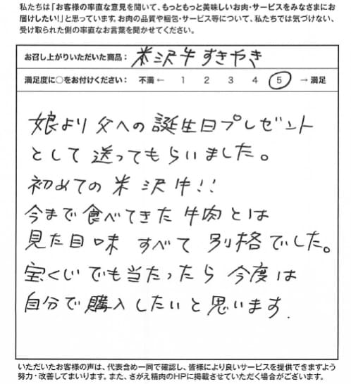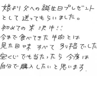 娘より父への誕生日プレゼントとして送ってもらいました。 初めての米沢牛!! 今まで食べてきた牛肉とは見た目味すべて別格でした。 宝くじでも当たったら今度は自分で購入したいと思います。