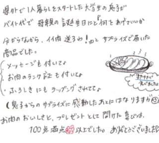 県外で1人暮らしをスタートした大学生の息子がバイト代で母親の誕生日にと『何をあげていいか分からないから、イイ肉送るわ!』とサプライズで届いた商品でした。 ・メッセージも付いて♪ ・お肉のランク証も付いて♪ ・ふろしきにもラッピングされてて♪ (息子からのサプライズに感動したあとにはなりますが)お肉のおいしさと、プレゼントとして開けた喜びは、100点満点以上でした。ありがとうございました♡