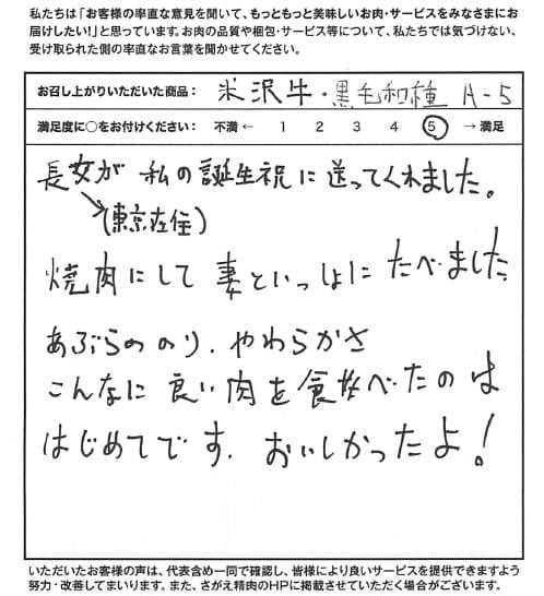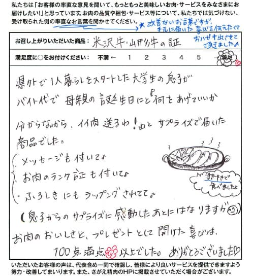 長男から誕生日祝に贈ってくれたもので、食べるまで良し悪しがわかりませんでしたが、メニューどおりに食べました。山形牛は初めて食べましたが、予想以上においしく大満足でした。 丁重なカルテを見て、心のこもった商品だと感動しましたし、不満や改善点はまったく見当たりません。 今後のご発展を祈念しております