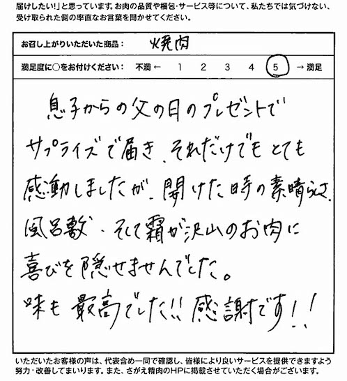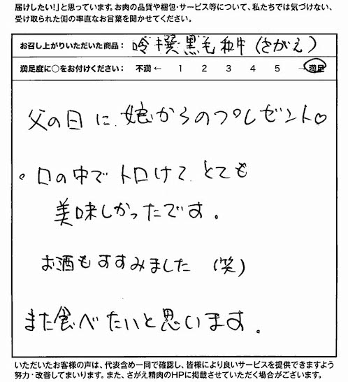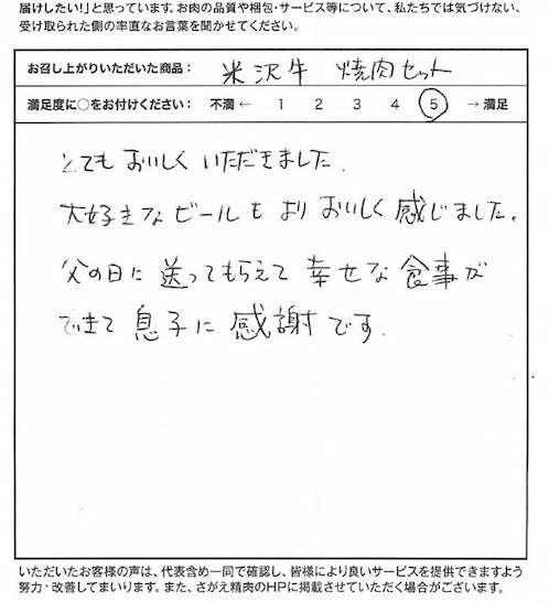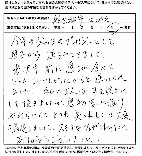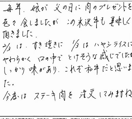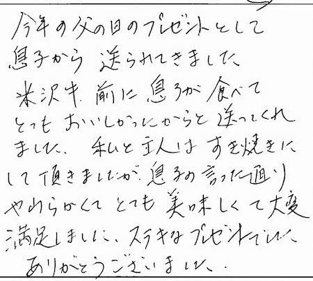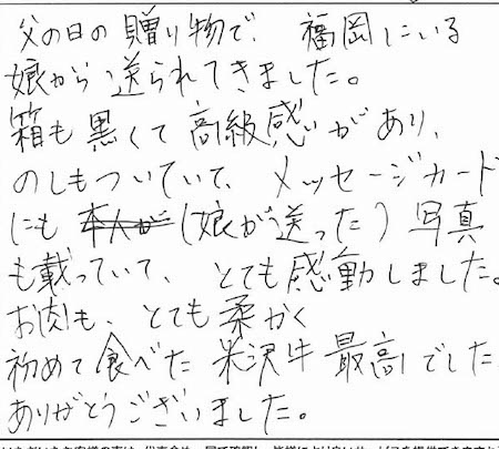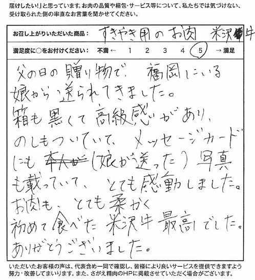 父の日の贈り物で、福岡にいる娘から送られてきました。箱も黒くて高級感があり、のしもついていて、メッセージカードにも(娘が送った)写真も載っていて、とても感動しました。お肉も、とても柔らかく初めて食べた米沢牛最高でした。ありがとうございました。