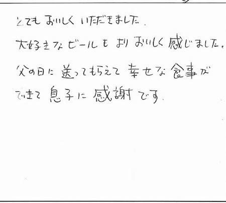とてもおいしくいただきました。大好きなビールもよりおいしく感じました。父の日に送ってもらえて幸せな食事ができて息子に感謝です。