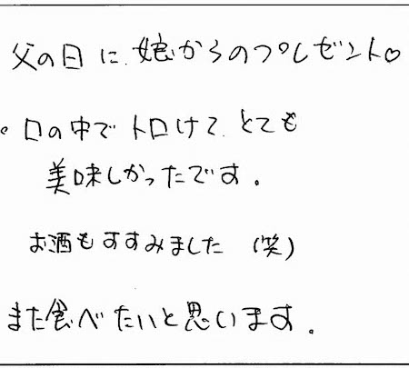 父の日に娘からのプレゼント♡口の中でトロけてとても美味しかったです。お酒もすすみました(笑)また食べたいと思います。