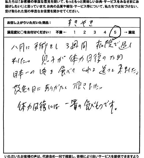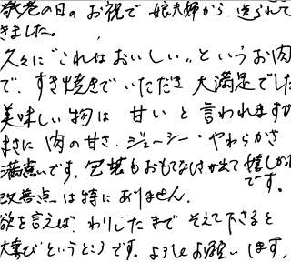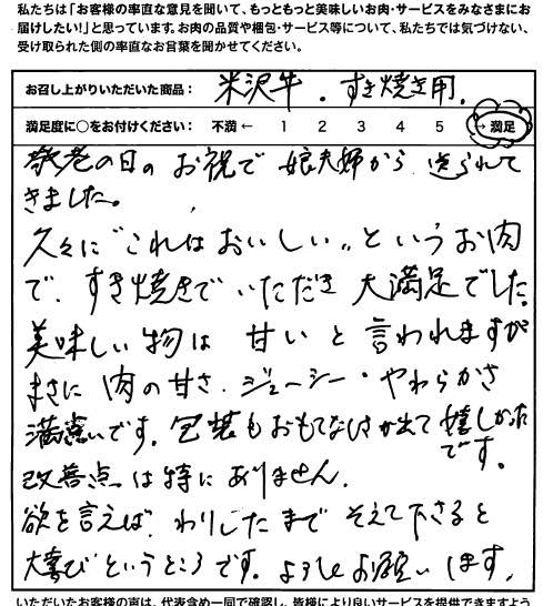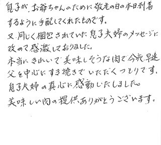 息子がお爺ちゃんのために敬老の日の本日到着するように手配してくれたものです。 又、同じく梱包されていた息子夫婦のメッセージに改めて感激しておりました。 本当にきれいで美味しそうな肉で今夜早速父を中心にすき焼きでいただくつもりです。 息子夫婦の真心に感動いたしました。 美味しい肉の提供ありがとうございます。