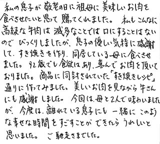 私の息子が敬老の日に祖母に美味しいお肉を食べさせたいと思って贈ってくれました。私もこんなに高級な牛肉は滅多なことでは口にすることはないのでびっくりしましたが、息子の優しい気持ちに感謝して、すき焼きを作り、同居している母に食べさせました。92歳でも食欲はあり、喜んでお肉を頂いておりました。商品に同封されていた「すき焼きレシピ」通りに作ってみました。美味しいお肉を見ながら牛さんにも感謝しました。今回は、母と2人で味わいましたが、今度は、離れている息子にも一緒にこのような幸せな時間をすごすことができたらうれしいと思いました。ご馳走さまでした。