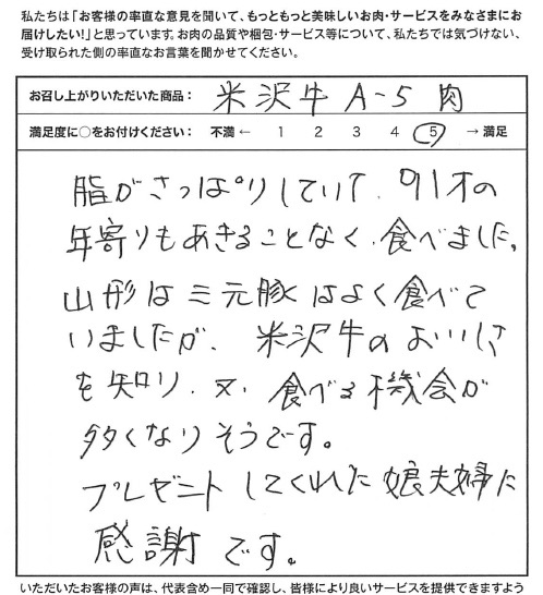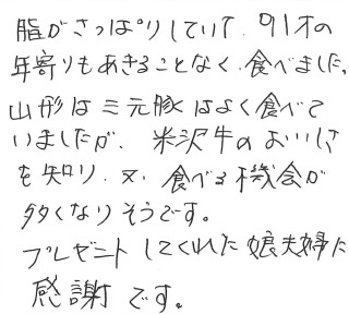 脂がしっかりしていて、91才の年寄りもあきることなく食べました。山形は三元豚はよく食べていましたが、米沢牛のおいしさを知り、又、食べる機会が多くなりそうです。プレゼントしてくれた娘夫婦に感謝です。
