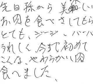 先日孫から美味しいお肉を食べさしてもらい、とても、ジージ、バーバーうれしく、今まで初めてこんなやわらかい肉を食べました
