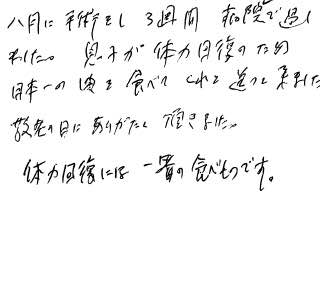 八月に手術をし3週間病院で過しました。息子が体力回復のため日本一の肉を食べてくれと送って来ました。敬老の日にありがたく頂きました。体力回復には一番の食べものです。