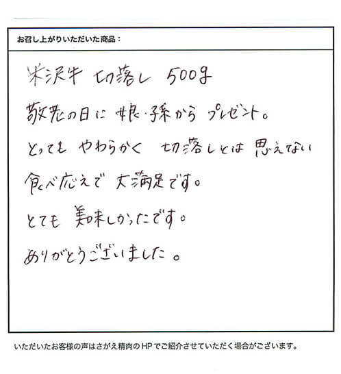 敬老の日に娘・孫からプレゼント。とってもやわらかく切落しとは思えない食べ応えで大満足です。とても美味しかったです。ありがとうございました。
