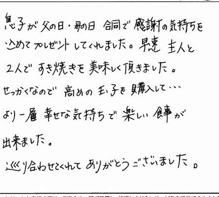 息子が父の日・母の日合同で感謝の気持ちを込めてプレゼントしてくれました。早速主人と2人ですき焼きを美味しく頂きました。せっかくなので高めの玉子を購入して...より一層幸せな気持ちで楽しい食事が出来ました。巡り合わせてくれてありがとうございました。