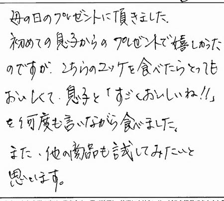 娘夫婦から母の日のプレゼントとしてもらいました。レシピをみながらどうして食べようかと考えた時、ふと高校1年のバスケットのプロになる「ゆめ」を、いだいて頑張っている、ただ1人の「まご」のやせた身体が目にうかび、娘夫婦にないしょで、孫にあげることにしました。改善点なんてありません。あえて、申し上げるなら大沼幸仁様の奥様のお顔がみたい、仕事もできて、優しそうで、きっと奥様も同じように、仕事ができて、優しそうで、きれいな方だと思うからです。5月28日で70才になる私ですが、夫には、優しい言葉をかけられたことはありません。ぐちをきいてくれてありがとう。