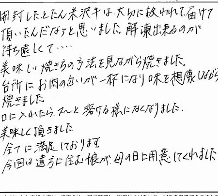 開封したとたん米沢牛は大切に扱われて届けて頂いたんだなぁと思いました。解凍できるのが待ち遠しくて... 美味しい焼き方の手法を見ながら焼きました。台所にお肉の匂いが一杯になり味を想像しながら焼きました。口に入れたらス〜と溶けるようになくなりました。美味しく頂きました。全てに満足しております。今回は遠方に住む娘が母の日に用意してくれました。