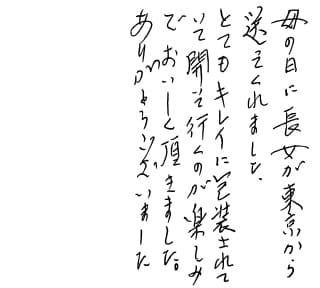 母の日に長女が東京から送ってくれました。 とてもキレイに包装されていて開いて行くのが楽しみでおいしく頂きました。ありがとうございました