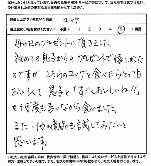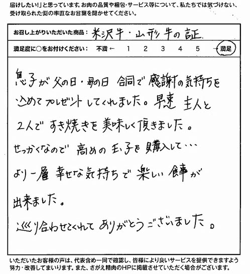 母の日のプレゼントでしたが、ていねいな包みで開けるのが楽しくワクワクさせました。「山形牛の証」というのも感動しました。もちろん味も最高でした。お肉のプレゼントは初めてもらって、開けて時のおいしそうな盛り付けも良かったです。しかもメッセージ付きというのも、又、びっくり! 言う事ナシのプレゼントでした。送り手の気持ちも充分伝わりました。