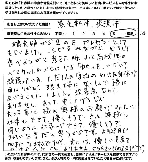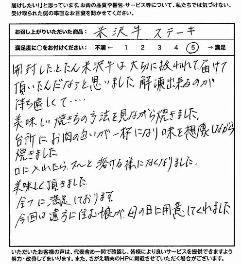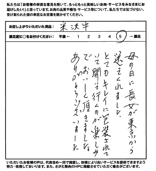 母の日に娘夫婦から贈られてきました。米沢牛は聞いたことはありましたが、いただくのは初めてで証明書付きにビックリ。ただいつも熊野牛の冷凍していないものをいただいているのであまり期待しておりませんでしたが、食べてビックリ。とても美味しいのです。いつもは苦手なサシの入った部分が絶品でした。ありがとうございます。牛さんにも生産者さんにもお肉屋さんにも娘夫婦にも感謝です。