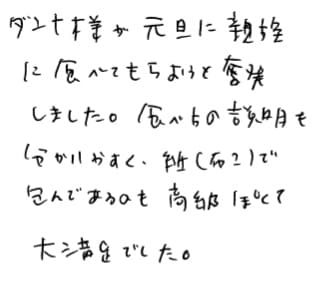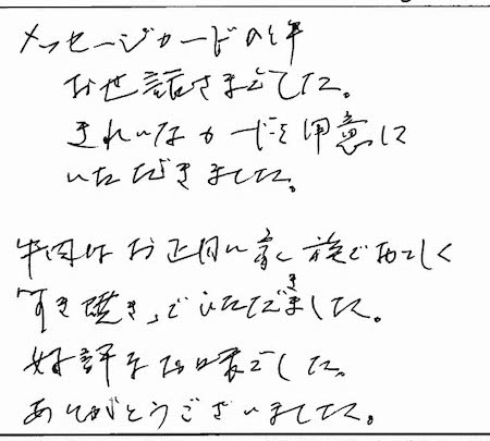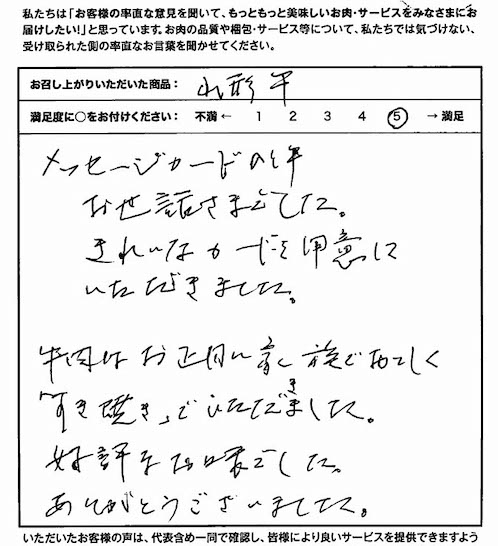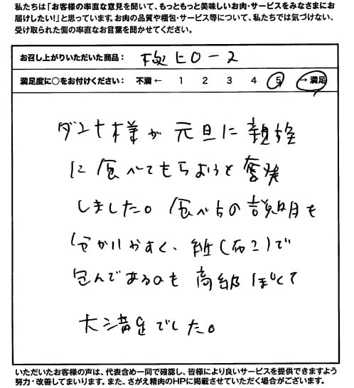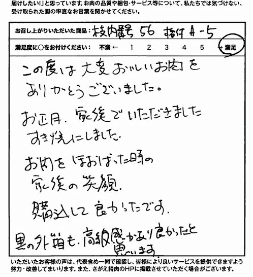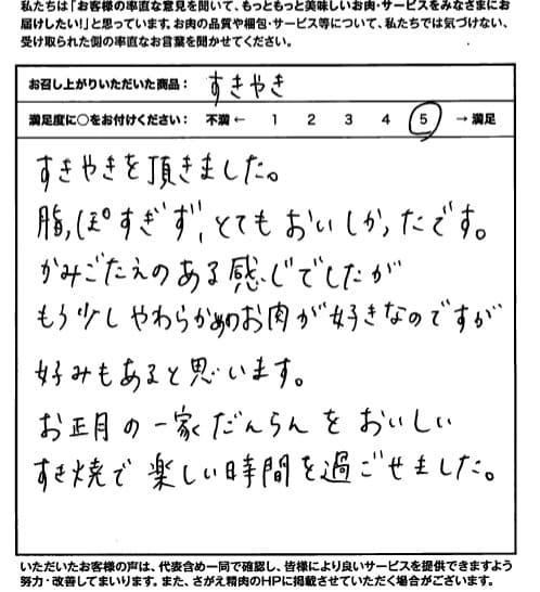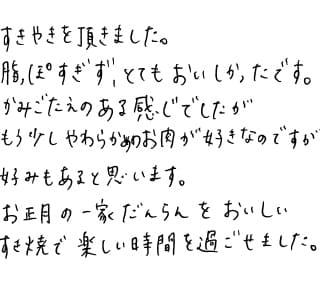 メッセージカードの件、お世話さまでした。きれいなカードを用意していただきました。牛肉はお正月に家族でおいしく「すき焼き」でいただきました。好評なお味でした。ありがとうございました。