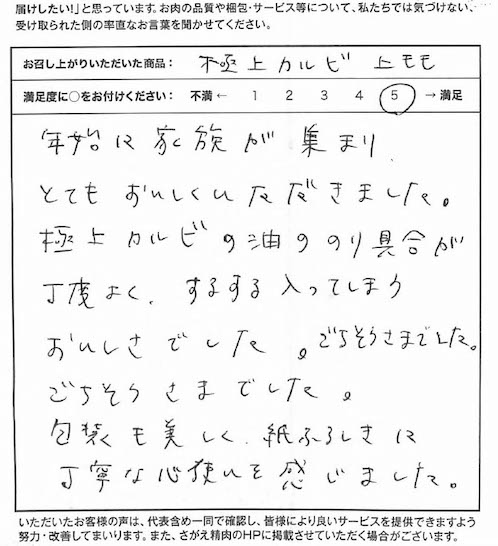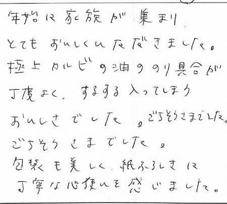 年始に家族が集まり、とてもおいしくいいただきました。極上カルビの油ののり具合が丁度よく、するする入ってしまうおいしさでした。ごちそうさまでした。ごちそうさまでした。包装も美しく、紙ふろしきに丁寧な心使いを感じました。