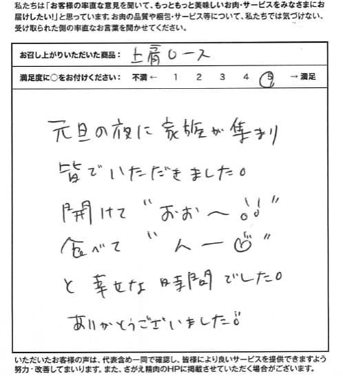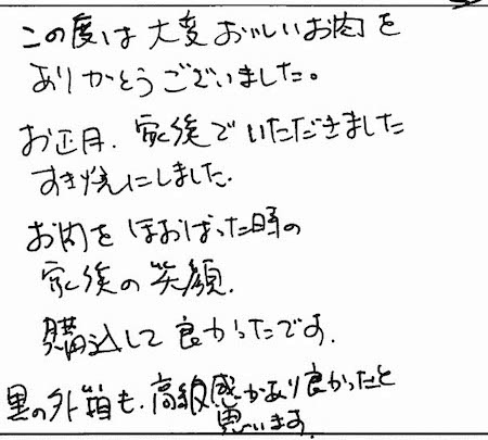 この度は大変おいしいお肉をありがとうございました。お正月、家族でいただきました。すき焼にしました。お肉をほおばった時の家族の笑顔。購入して良かったです。黒の外箱も高級感があり良かったと思います。