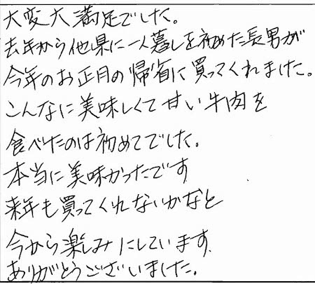 大変満足でした。去年から他県に一人暮らしを初めた長男が今年のお正月の帰省に買ってくれました。こんなに美味しくて甘い牛肉を食べたのは初めてでした。本当に美味しかったです。来年も買ってくれないかなと今から楽しみにしています。ありがとうございました。