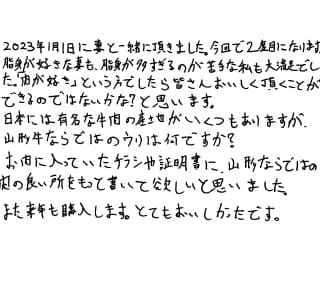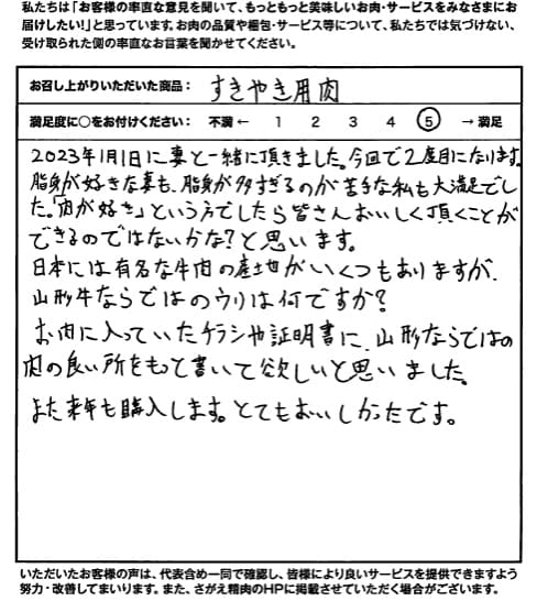 2023年1月1日に妻と一緒に頂きました。今回で2度目になります。脂身が好きな妻も、脂身が多すぎるのが苦手な私も大満足でした。「肉が好き」という方でしたら皆さんおいしく頂くことができるのではないかな?と思います。 日本には有名な牛肉の産地がいくつもありますが、山形牛ならではのウリは何ですか? お肉に入っていたチラシや証明書に、山形ならではの肉の良いところをもっと書いて欲しいと思いました。 また来年も購入します。とてもおいしかったです。