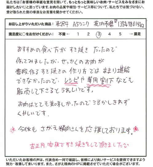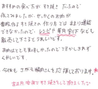 おすすめの食べ方がすき焼きだったので作ってみましたが、せっかくのお肉が普段作るすき焼きの作り方ではあまり堪能できなかったので、レシピや専用割下なども販売してくださるとうれしいです。 お肉はとても美味しかったので活かしきれずくやしいです。 今後もさがえ精肉さんを応援しております。 お正月、家族ですき焼きをして頂きました
