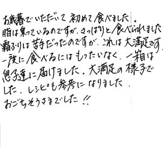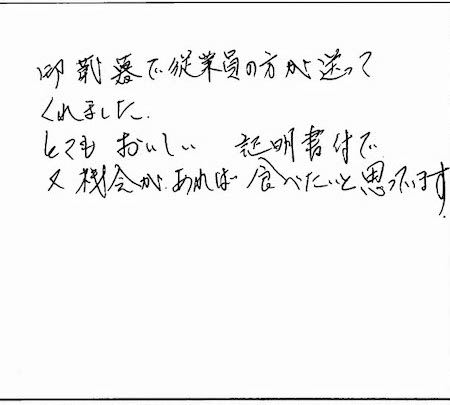 御歳暮で従業員の方が送ってくれました。とてもおいしい。証明書付で又機会があれば食べたいと思っています。