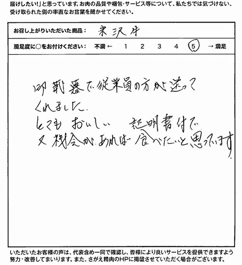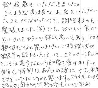 お歳暮として頂きました。包装もとても美しく、証明書も付いており、とてもていねいな対応だと思いました。 食べる前から、見るからに美味さが伝わる肉でした 味は予想を越える味でした ごちそう様でした。ありがとうございました。