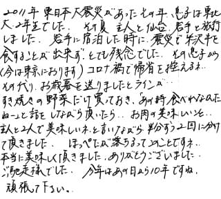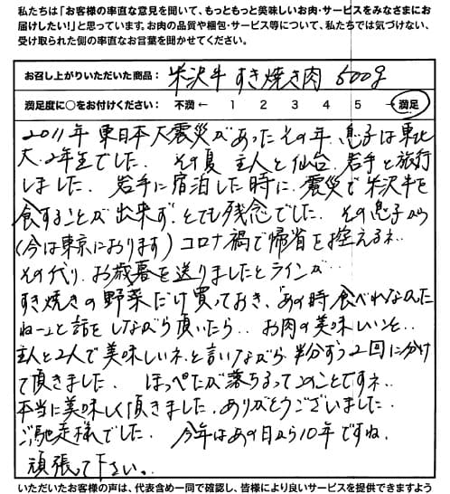 2011年東日本大震災があったその年、息子は東北大2年生でした。 その夏、主人と仙台・岩手と旅行しました。岩手に宿泊した時に、震災で米沢牛を食すことができず、とても残念でした。 その息子から(今は東京におります)「コロナ禍で帰省を控えるネ…その代わり、お歳暮を送りました」とのラインが… すき焼きの野菜だけ買っておき、「あの時食べれなかったねー」と話をしながら頂いたら、お肉の美味しいこと… 主人と二人で美味しいね、と言いながら、半分ずつ2回に分けて頂きました。 ほっぺたが落ちるってこのことですネ。本当に美味しく頂きました。ごちそうさまでした。 今年はあの日から10年ですね。頑張ってください。